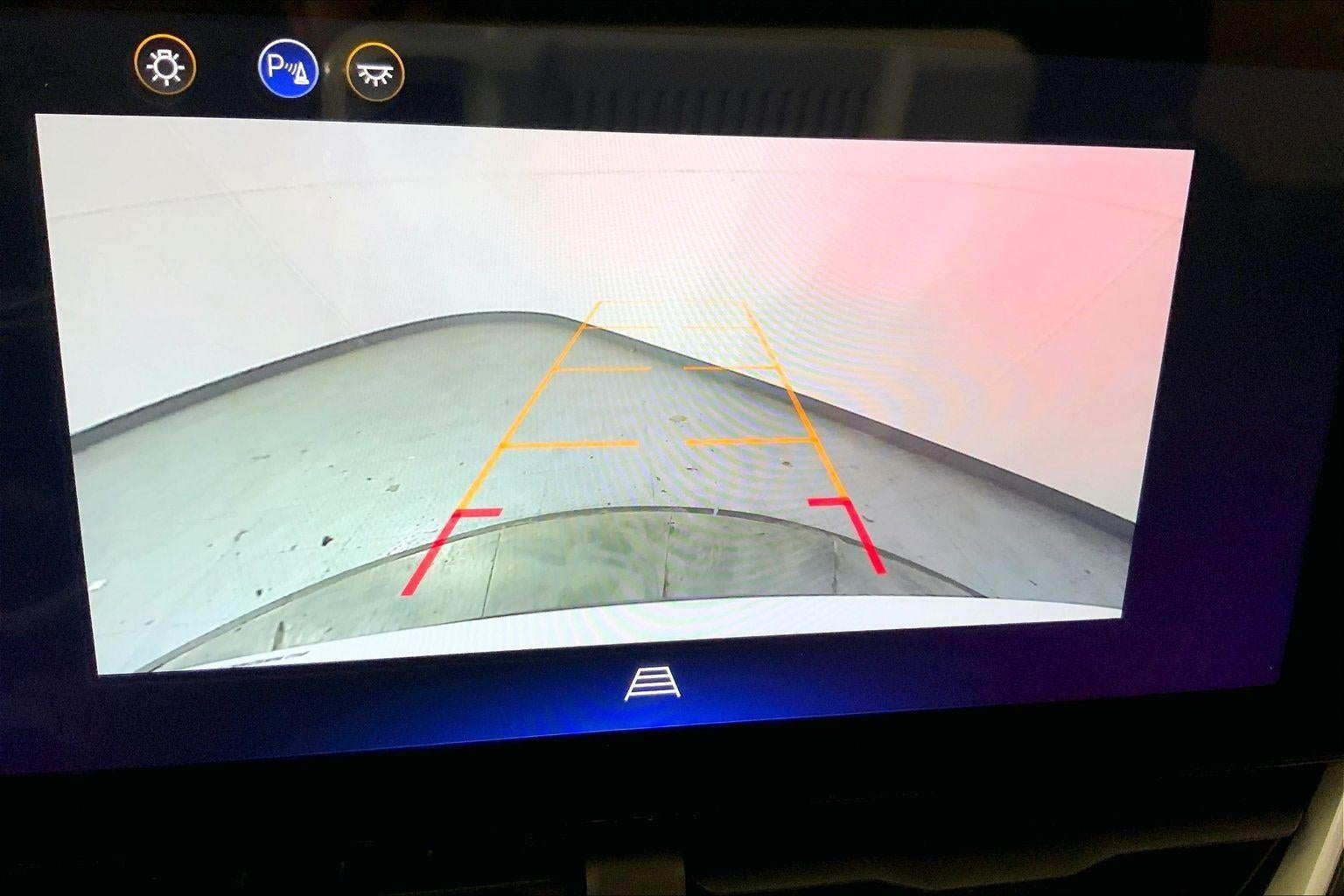 - The vehicle is equipped with a camera that displays an image of the area behind the vehicle on an interior display.